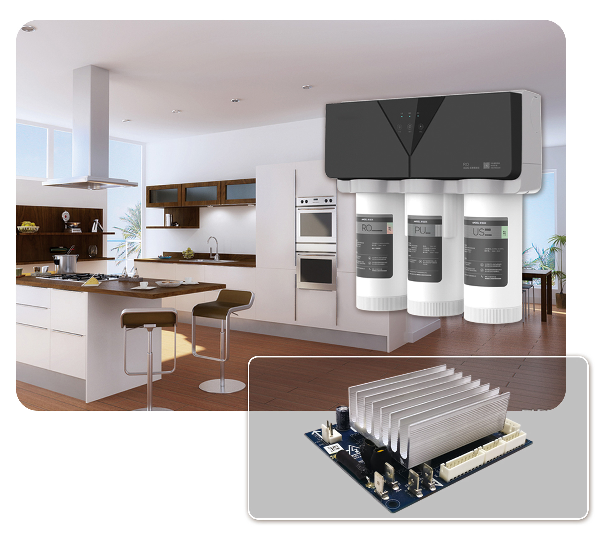 通過MCU、高效率電源管理電路、直流水泵驅動電路、水泵電流采樣電路、加熱管驅動電路,實現自來水凈化后即熱加熱控制、自動上水補水控制、定量出水控制、TDS水質檢測、語音識別等功能,并滿足低待機功耗要求。